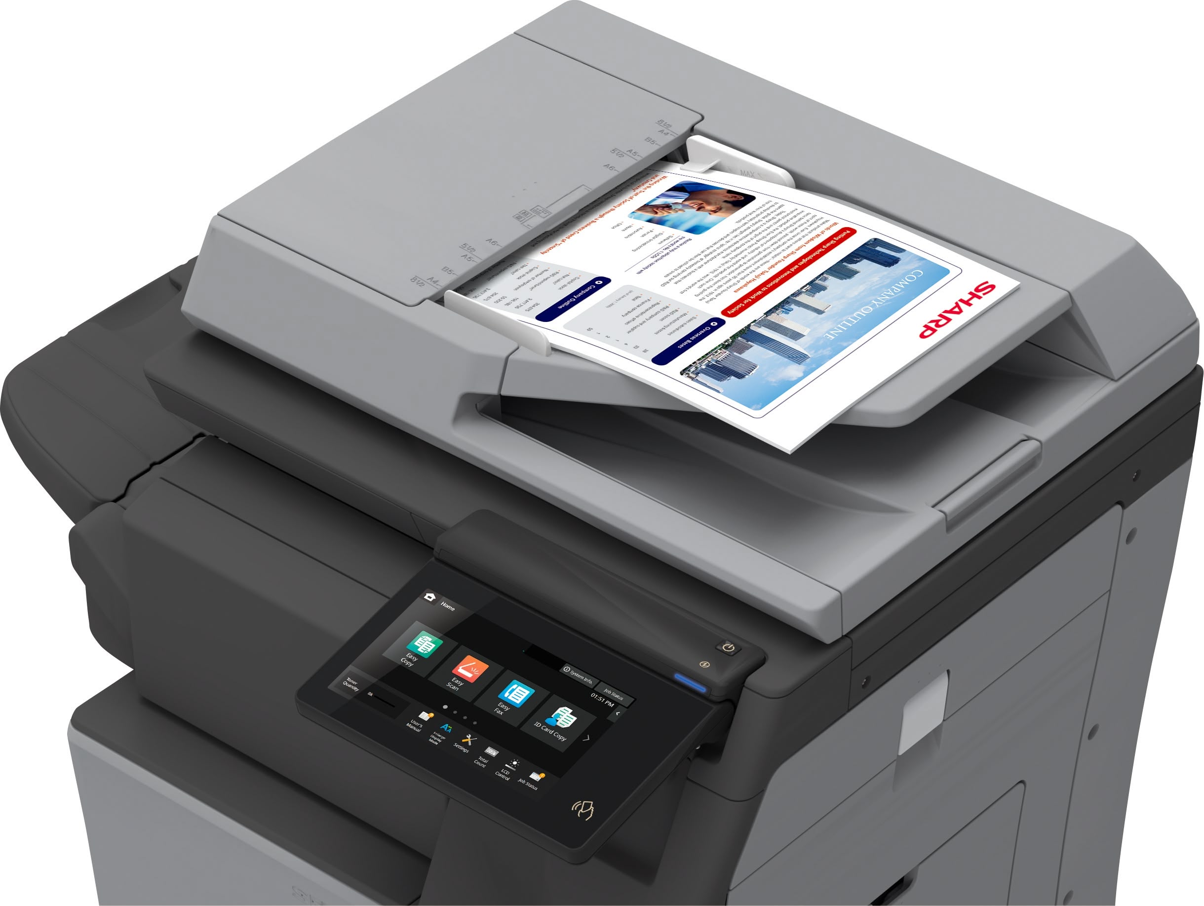 - 100-sheet duplexing document feeder on the BP-B550WD scans both sides of a document in a single pass. This enhances productivity while maintaining the integrity of original copies and minimizing wear on the feeder.