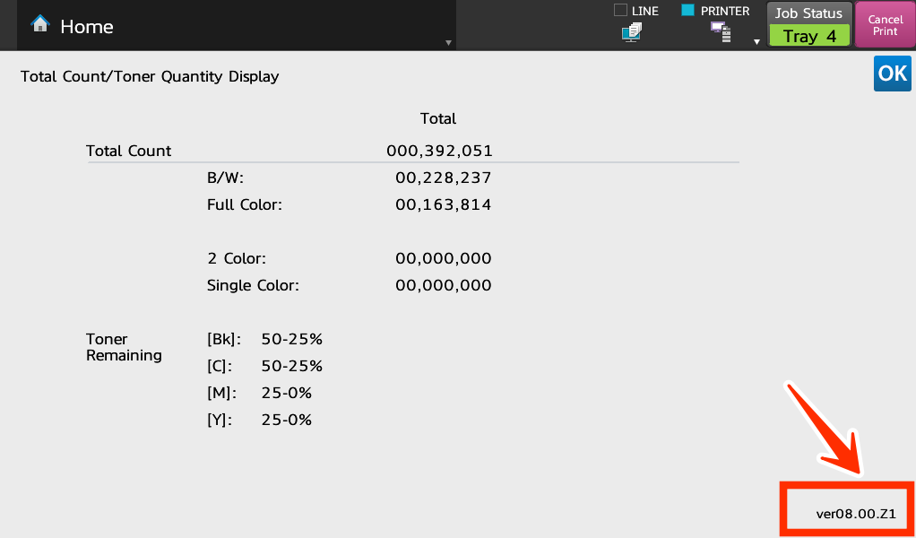 This is the current production model touch screen. Your copier model should begin with BP. You’ll have a 10.1 inch touch panel with a “Home” button in either the top-left corner, or the top-right corner of the display itself. It is shaped like a house – this is the button we’ll use. To enter the simulation mode with this style, double-tap the house button, then tap the version number in the bottom-right corner of the Total Count pop-up. It doesn’t look like a button, but it will open the simulation menu.